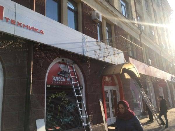 В центре Днепра начали менять огромную вывеску популярного магазина «Jam» на проспекте Дмитрия Яворницкого напротив Днепровского городского совета.