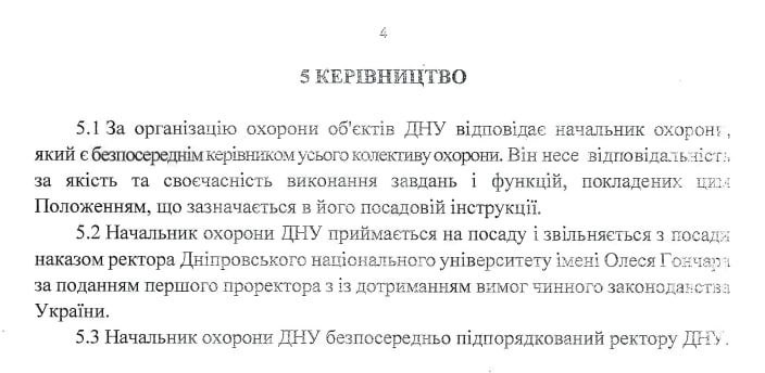 Адже призначає керівника охорони ВНЗ саме ректор. А призначенню має передувати ретельна перевірка особи, яка буде відповідати за безпеку у ВНЗ, за охорону численних корпусів та просторів ДНУ, що територіально розташовані у різних локаціях у Дніпрі.