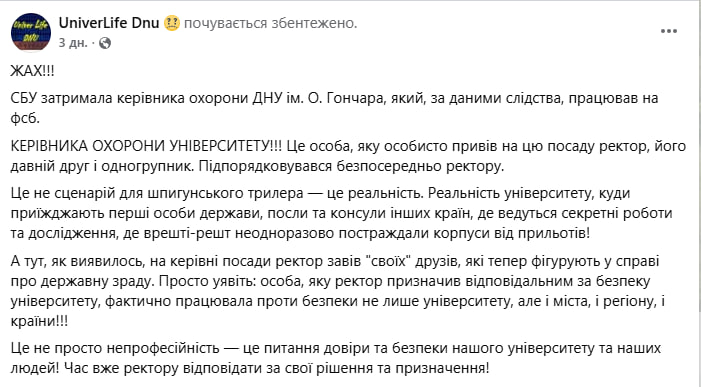 У дописі на неформальній ФБ-сторінці ДНУ, яка присвячена повсякденному життю університета, з болем наголошують: керівник охорони, який виявився ворожим агентом, був одним з “друзів” ректора, який призвів на керівни посади власну команду. Втім працював топ-охоронець не задля безпеки навчального закладу, а в інтересах країни-агресора.
