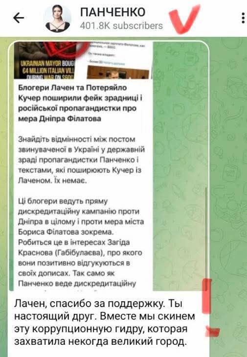 Російська пропагандистка родом з України та ексведуча проросійських каналів Медведчука Діана Панченко, що знаходиться під санкціями в Україні та Європейському Союзі, подякувала блогеру Лачену (Ігорю Лаченкову) за підтримку її пропагандистського російського фейку проти мера Дніпра Бориса Філатова. При цьому Панченко назвала Лачена “справжнім другом”. Про це повідомляє Gorsovet з посиланням на телеграм-канал “Дніпро Оперативний”.